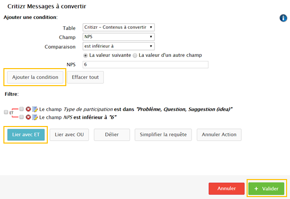 Indiquez votre cible avec laquelle le contenu Critizr se transformera en demande dans easiware. N’oubliez pas d’ajouter la condition (en cliquant sur le bouton) et de valider votre cible.