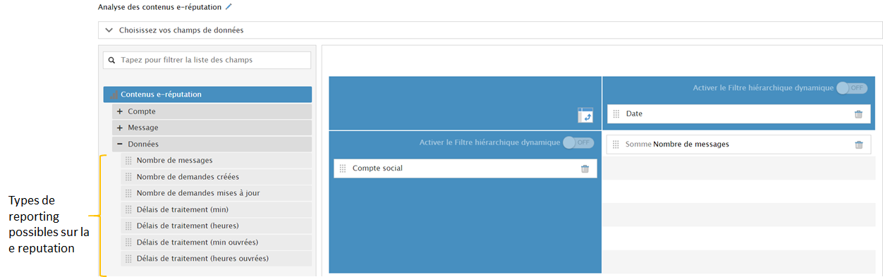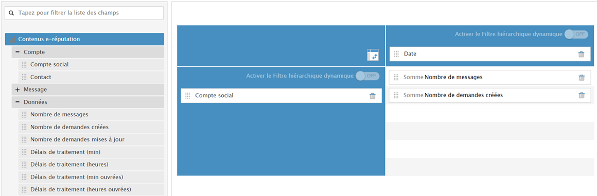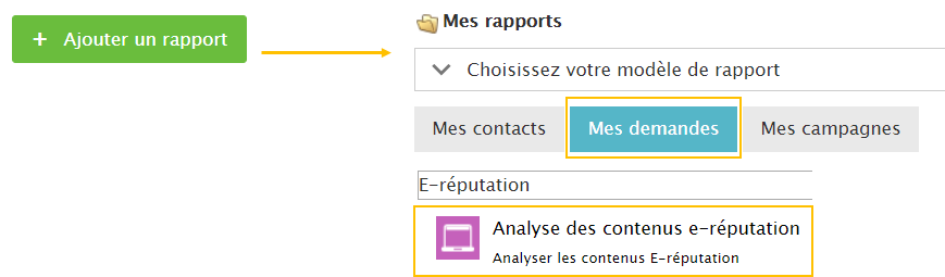 Lorsque vous cliquez sur « ajouter un rapport », et que vous cliquez ensuite sur « mes demandes », et « Analyse des demandes », vous arrivez sur l’écran de création de vos rapports avec un rapport prédéfini sur la ereputation :