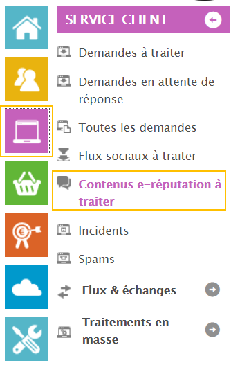 Vous avez accès aux flux Avis vérifiés en cliquant sur “service client” et “contenus e-reputation à traiter” :