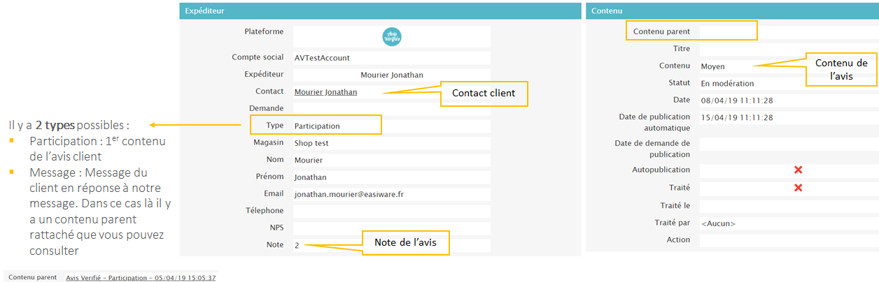 Transformer ce flux en demande manuellement si, par exemple, la note de l’avis est bonne mais le contenu ne l’est pas. Et que vous souhaitez faire une modération de l’avis ( explication dans la page suivante sur le traitement d’une demande).