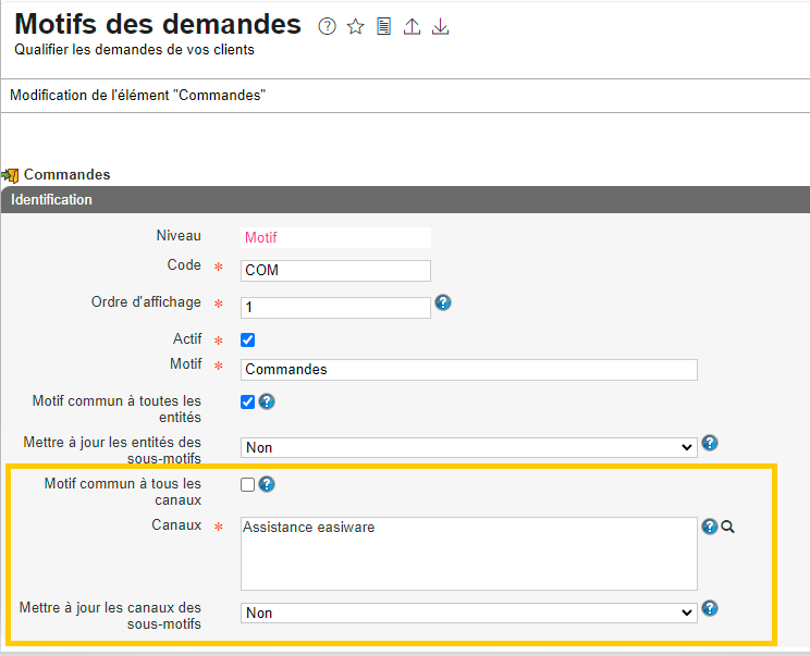 L’affichage du motif sur la demande du client est conditionnable en fonction du canal de la demande. L’administrateur easiware peut créer des motifs différents en fonction des canaux. Cette fonctionnalité est faite pour un affichage des motifs sur la demande du client selon le canal de contact. Elle est donc visible pour l’agent. Cette fonctionnalité n’est pas répercutée coté client sur le formulaire web.
