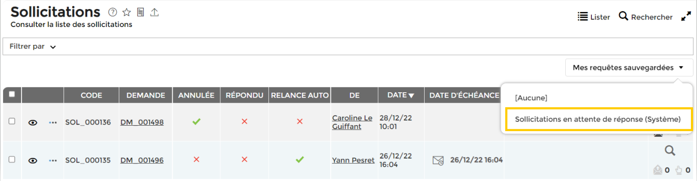 De plus, une nouvelle requête système a été créée pour afficher rapidement les sollicitations sans réponse ( “service client”, “flux & échanges”, “sollicitations”)