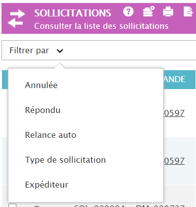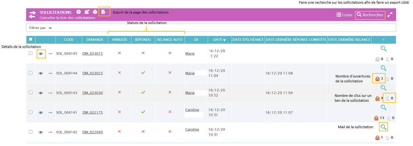 Une sous-page “Sollicitations” a été créée dans la page des demandes afin de pouvoir consulter et exporter vos sollicitations. L’export est possible pour les profils Administrateurs.