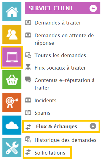 Pour y accéder, cliquez sur “service client”, “flux et échanges” et “Sollicitations” :