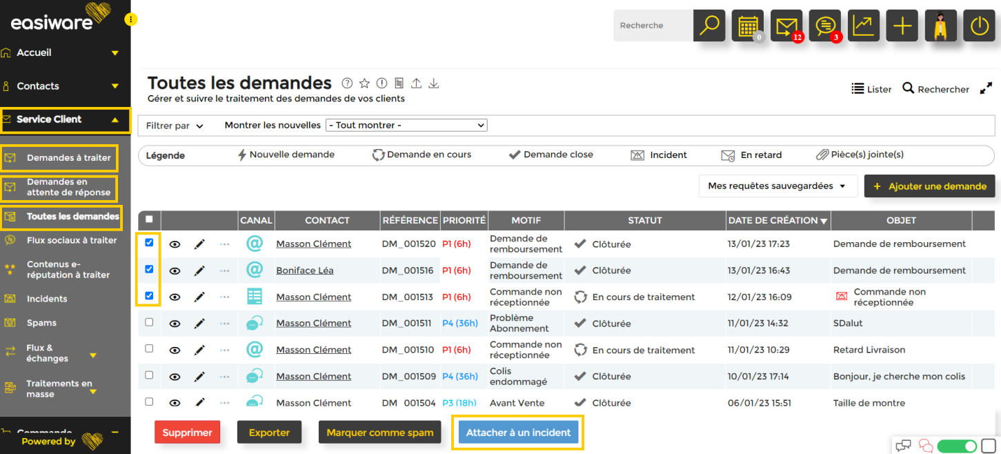 Maintenant, dans le menu “Service Client” sur les pages “Demandes à traiter”, “Demandes en attente de réponse” ou “Toutes les demandes” , en cliquant sur la case à gauche de la ligne des demandes, vous pouvez sélectionner plusieurs demandes et les rattacher en une seule fois à un incident en cliquant sur le bouton du bas “Attacher à un incident”.