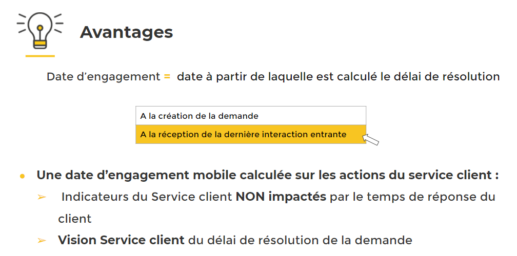 ● La date d'engagement ne sera pas mise à jour à la suite d'une interaction avec le contact pour : Un commentaire NPS, une réponse à une sollicitation et un commentaire lorsque le contact ferme lui-même sa demande