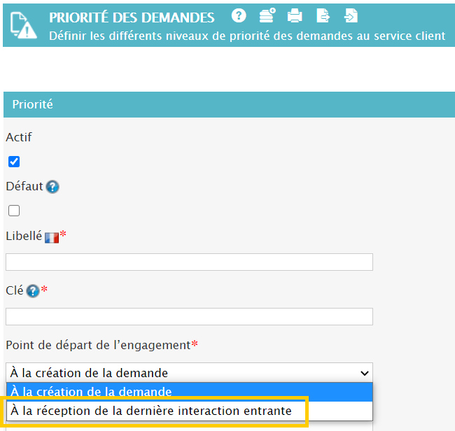 Désormais, lors de la configuration d'une priorité de demande : la date d'engagement peut être calculée à partir de la date de la dernière interaction entrante du contact au lieu de la date de création de la demande.