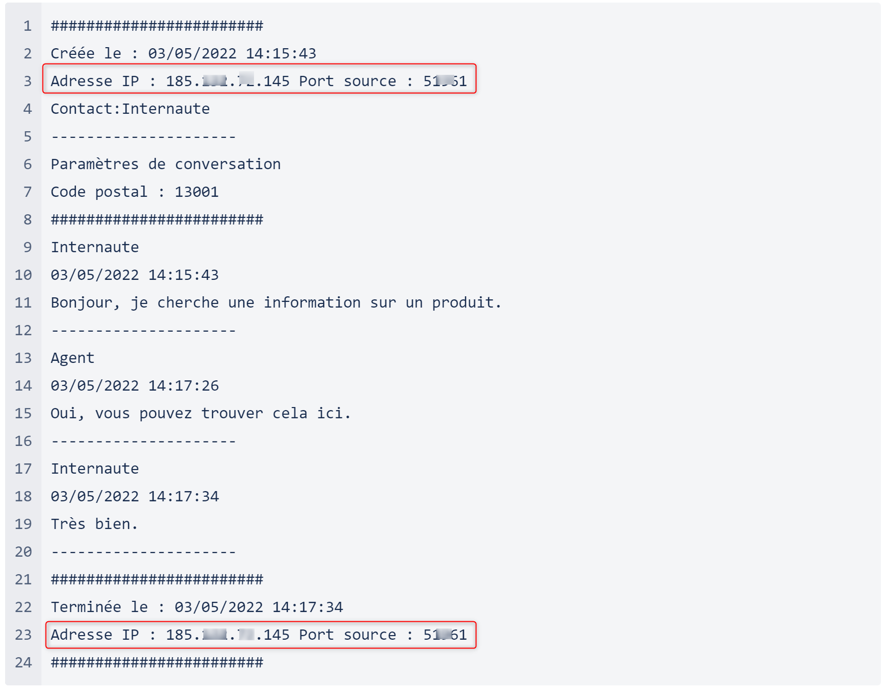Le formalisme de la donnée a été repensé : Désormais, l’IP et le Port source de l’usager sont présentés en début et en fin de conversation.