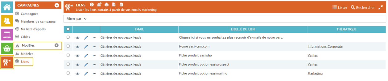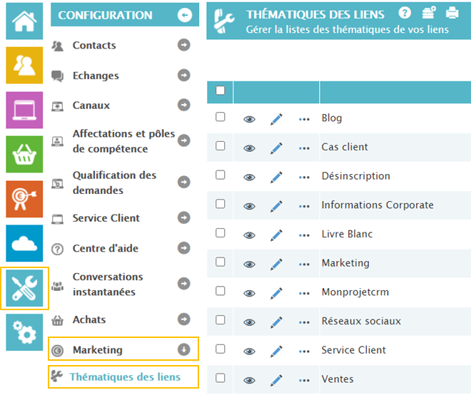 Il est possible de rattacher les liens à une thématique, créée au préalable sous Configuration > Marketing > Thématiques des liens :