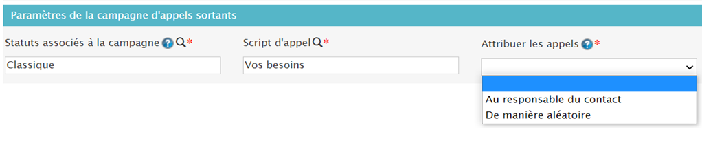 Sélectionnez les statuts de votre campagne en cliquant sur la loupe ainsi que le script d’appel :