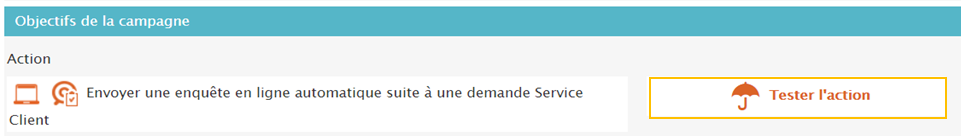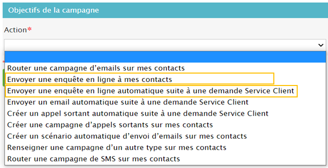 Choisissez l’action pour cette campagne, c’est-à-dire son objectif. Pour une enquête en ligne, vous avez 2 actions possibles :