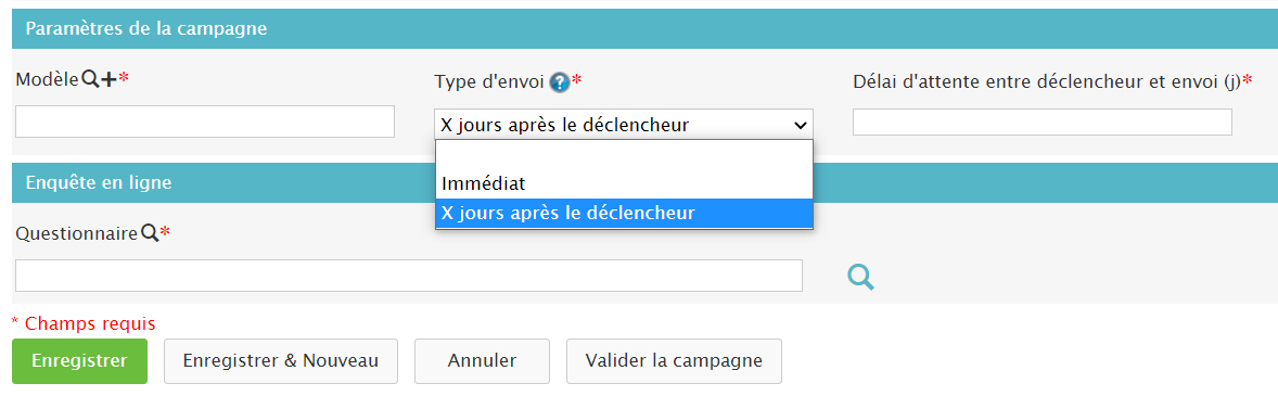 Vous allez déterminez ici les conditions de déclenchements de cette enquête en ligne et à partir de quelle date de création de la demande cette enquête va être envoyée :