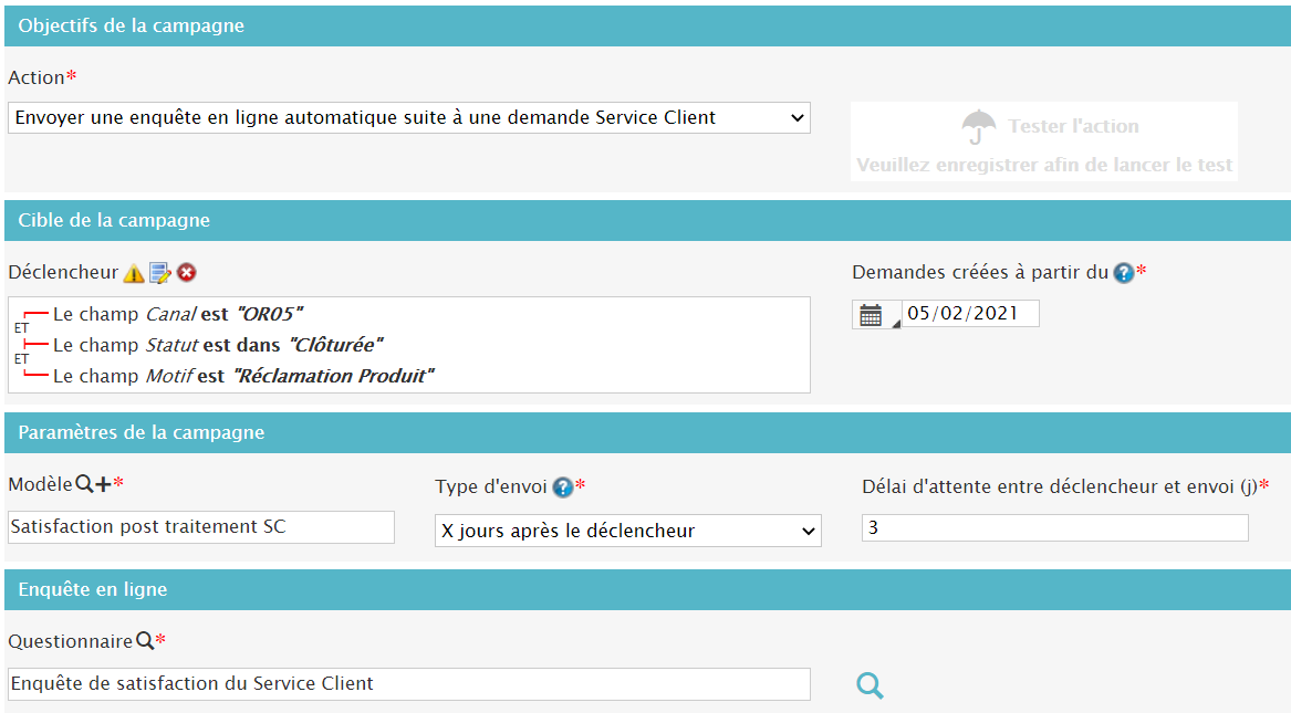 Voici un exemple : L’enquête en ligne va s’envoyer aux clients ayant une demande mail ORO5 avec le motif “réclamation produit”, 3 jours après la clôture.