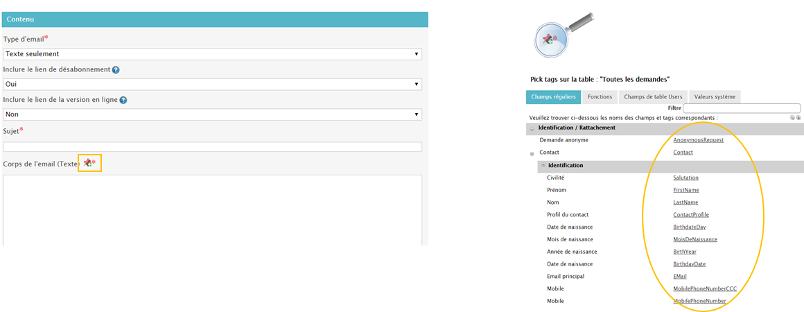Si vous avez choisi le format texte seulement, il faut taper le texte directement dans easiware. Vous avez la possibilité d’intégrer des champs de fusion (Pick tags) :