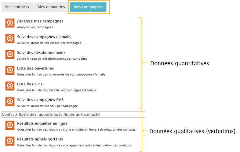 Cliquez sur “Mes Campagnes” et plusieurs reportings sont prédéfinis pour les Campagnes :