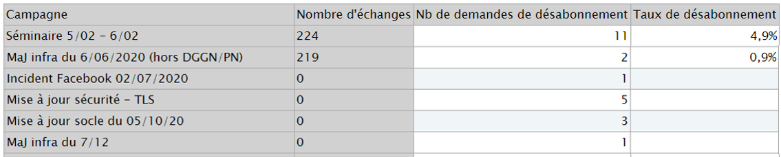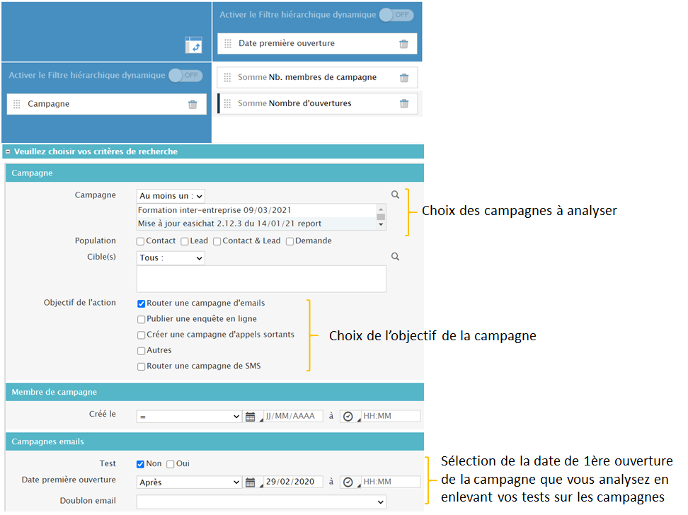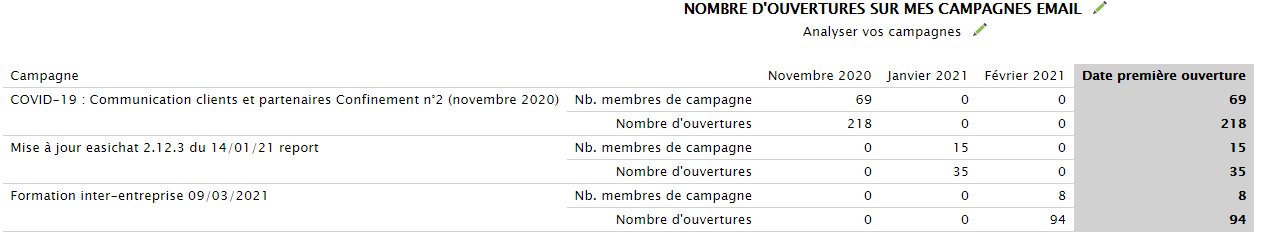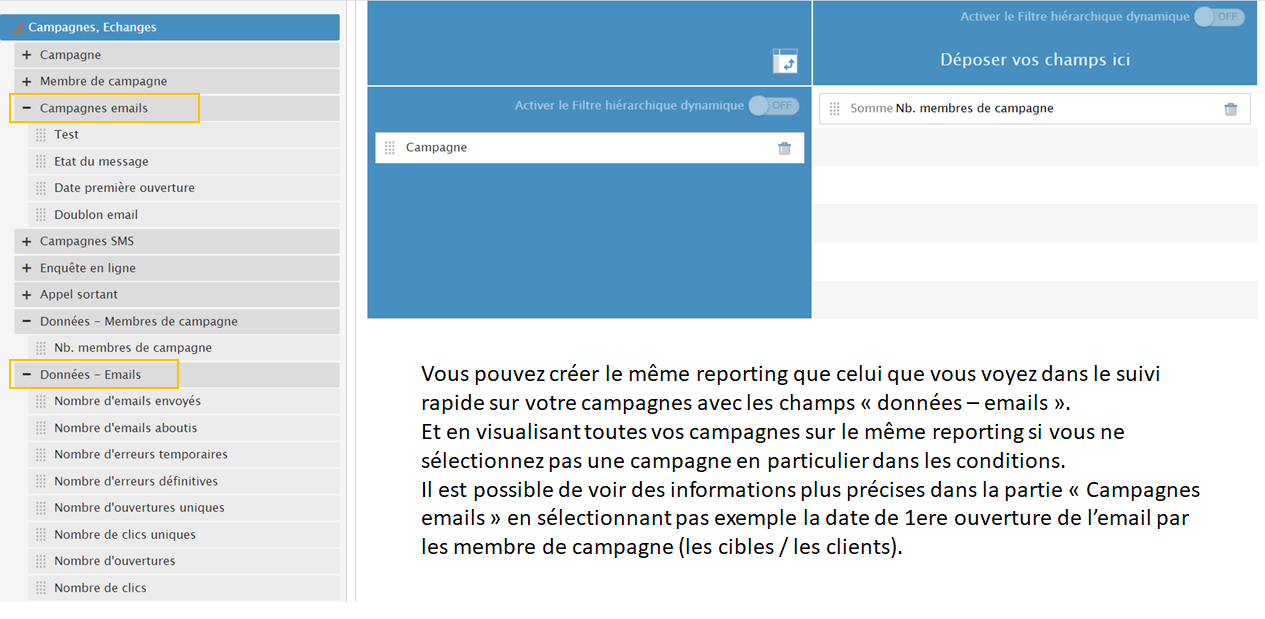 Vous pouvez créer plusieurs reportings sur vos campagnes email ou sms. Vous trouverez ci-dessous des exemples de reporting. Si vous souhaitez savoir comment créer un reporting avec toute sa mise en forme allez sur cette documentation : Le reporting.