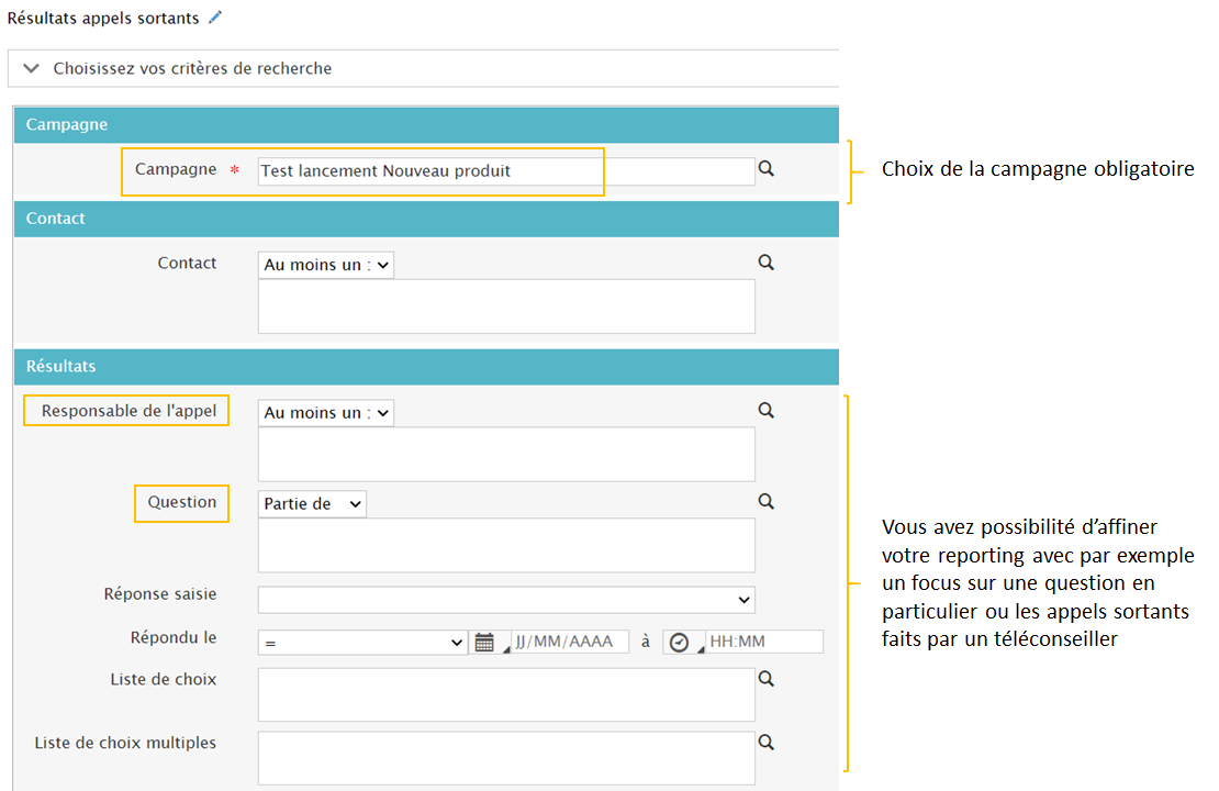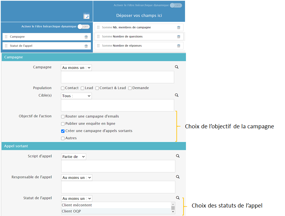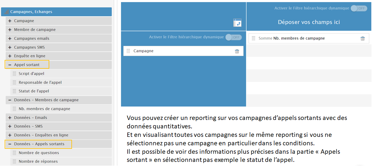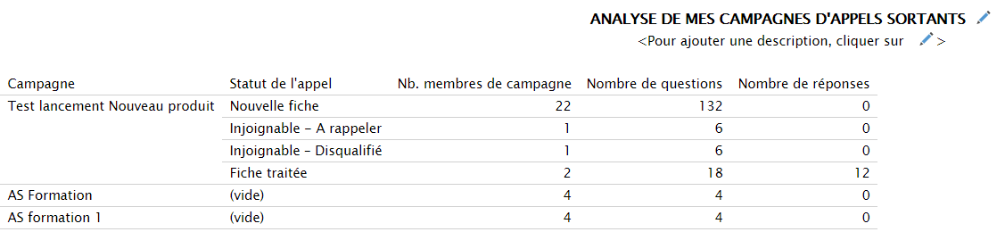 Vous pouvez créer plusieurs reportings sur vos campagnes d’appels sortants. Vous trouverez ci-dessous des exemples de reporting. Si vous souhaitez savoir comment créer un reporting avec toute sa mise en forme allez sur cette documentation : Le reporting.