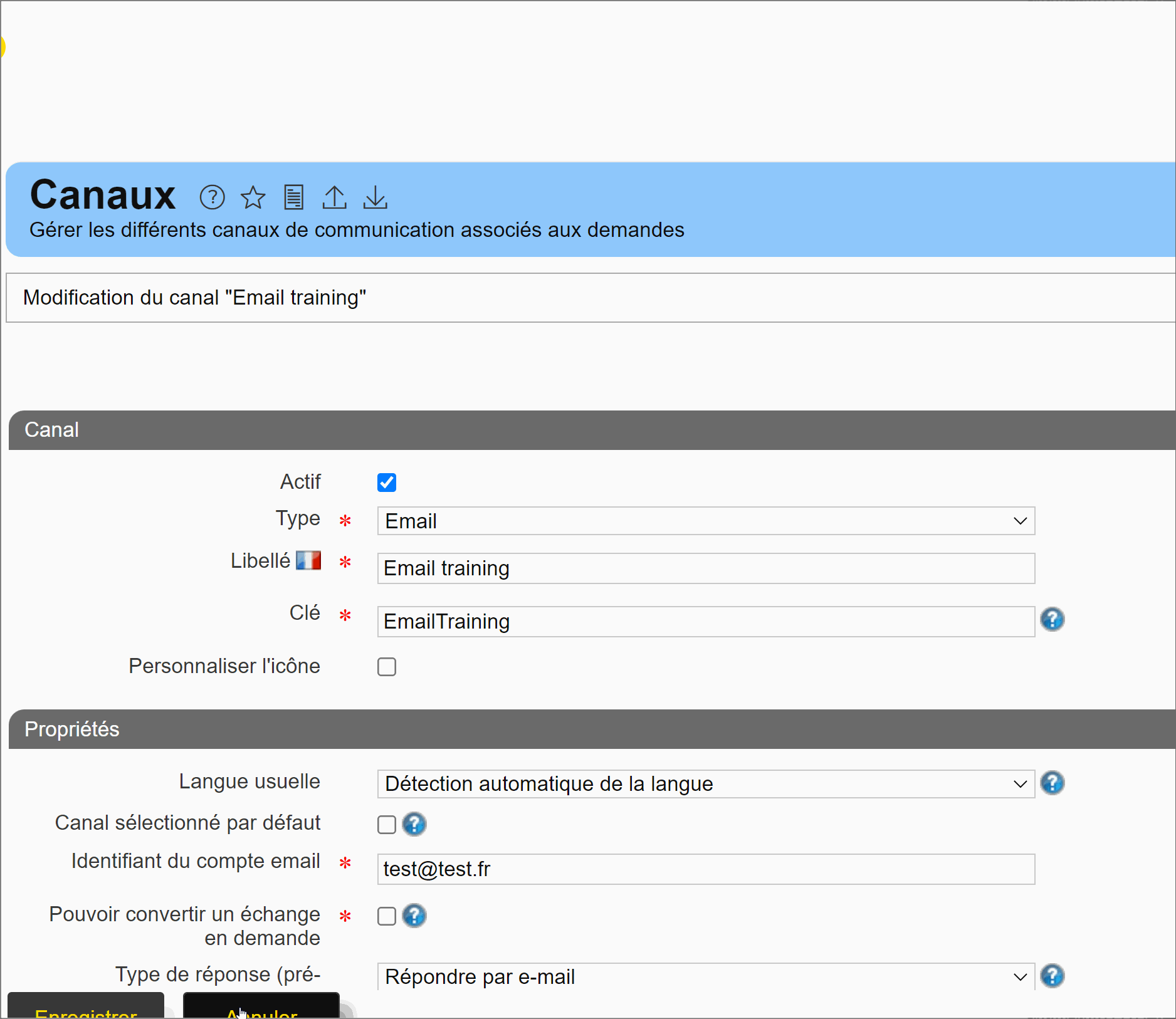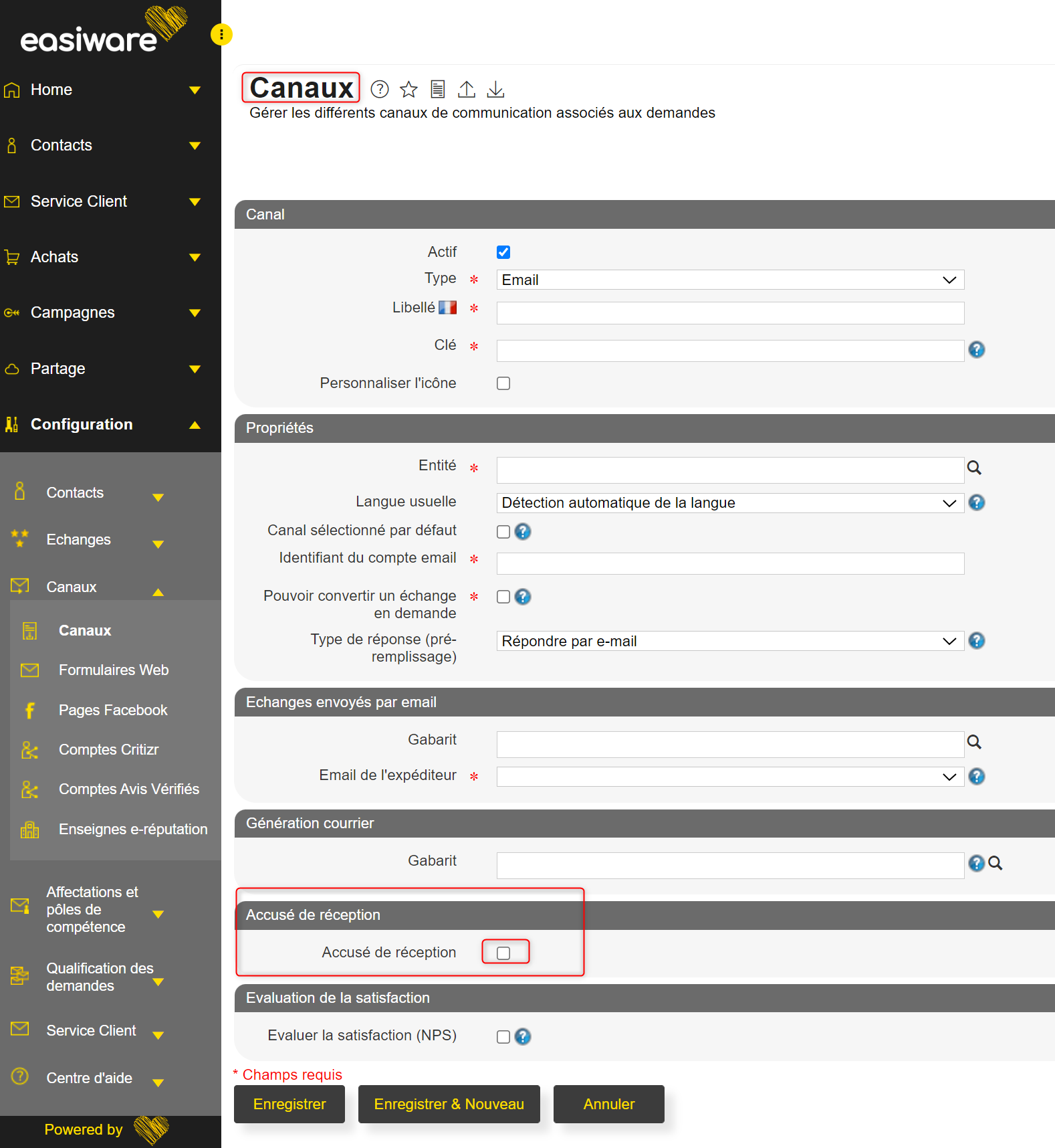 Après quelques minutes, si vous ne constatez pas de nouvel email, vous pouvez réactiver l’accusé de réception sur le canal en cochant de nouveau la case “Accusé de réception” depuis la page Canaux et en remettant les informations renseignés initialement (capture que vous avez dû faire).