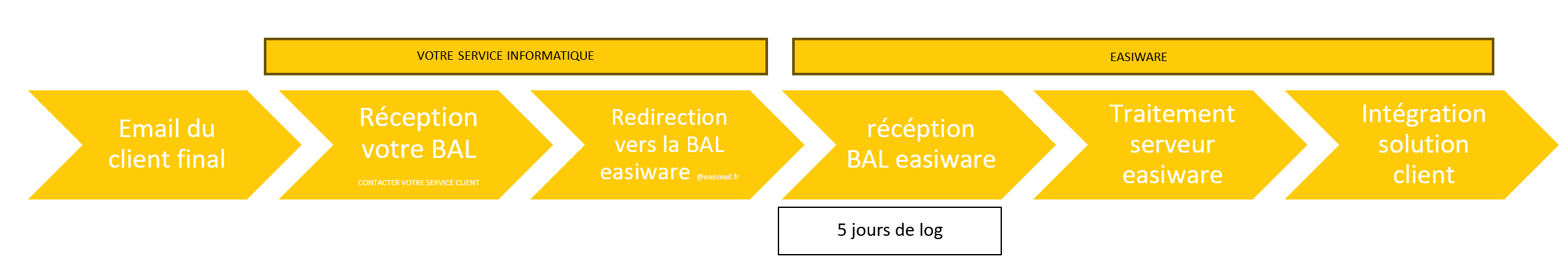 Les emails sont réceptionnés côté easiware dans une boite mail de transition, où les emails sont gardés 5 jours.