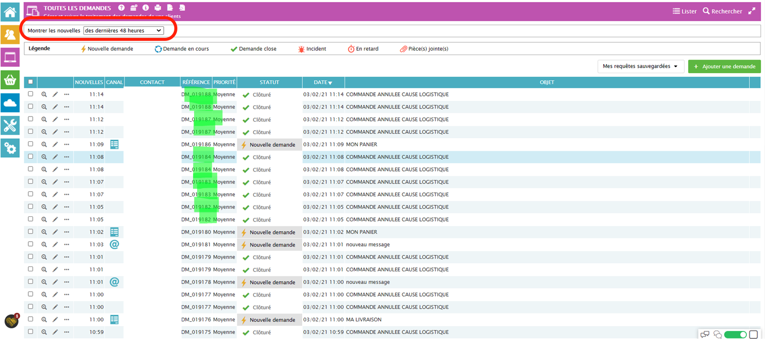 Cela ne veut pas dire que les demandes arrivent en double mais lorsque nous appliquons le filtre “Montrer les nouvelles” sur les dernières 24h ou 48h ou autres, le filtre s’applique sur la date de création et la date de dernière modification de la demande. Ce qui veut dire que si la demande a été créée puis modifiée dans l’intervalle du filtre demandé, celle-ci s’affichera deux fois.