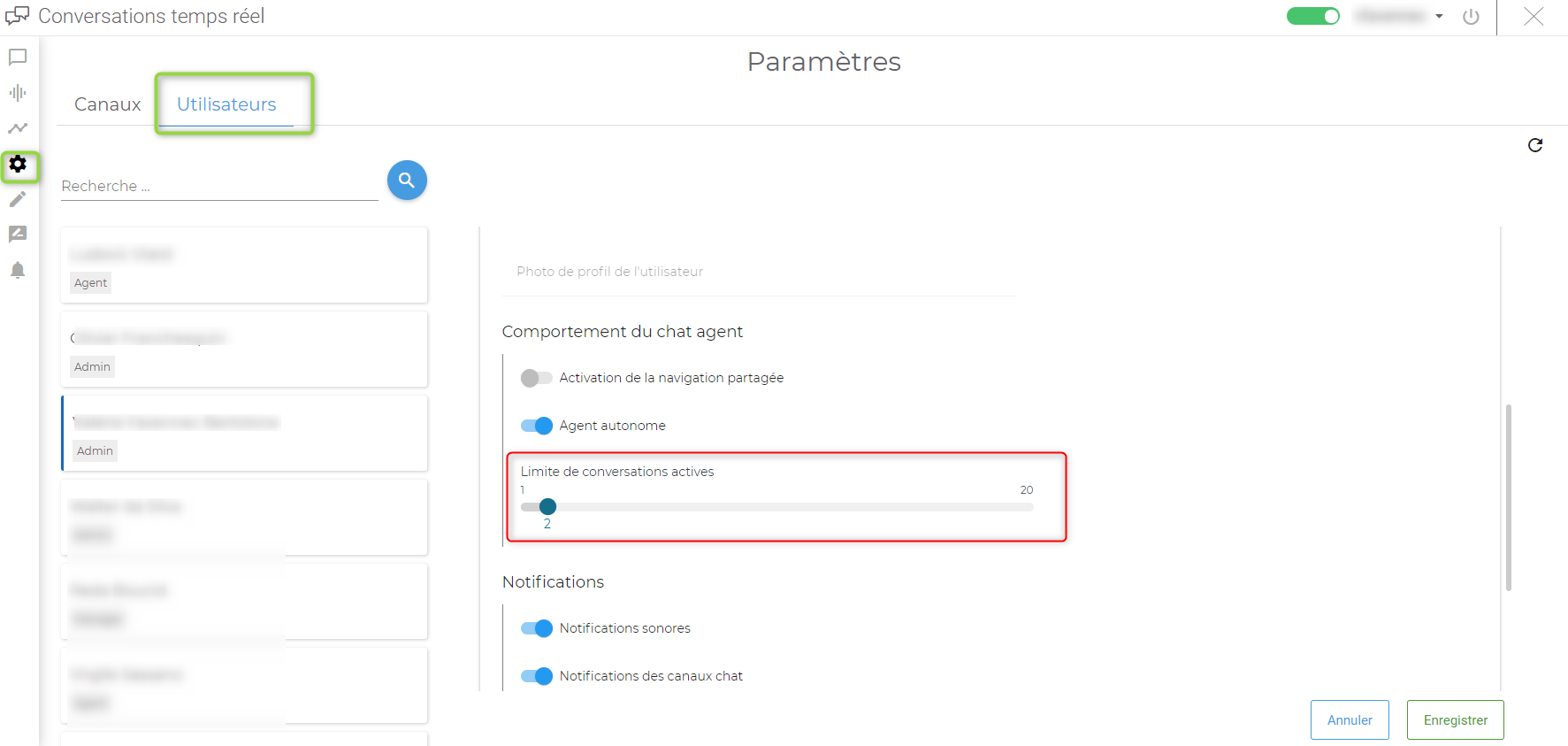 Si dans la supervision des conversations temps réel, vous constatez que l’agent a atteint le seuil défini, il ne sera pas possible de lui transférer de nouvelles conversations.