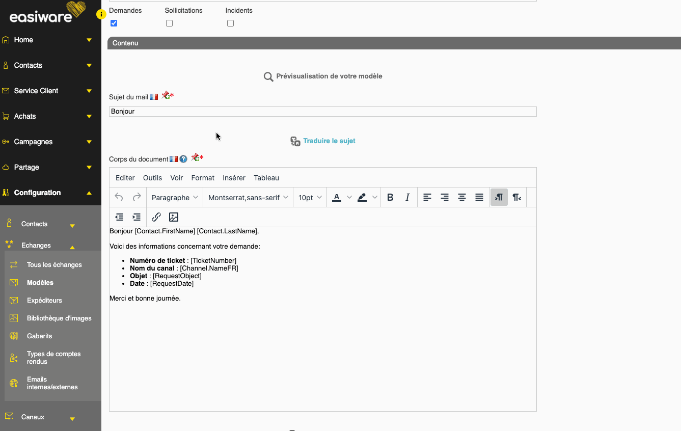 Pour ce faire, allez dans le menu Configuration → Échanges → Modèles puis sélectionner le modèle souhaité.