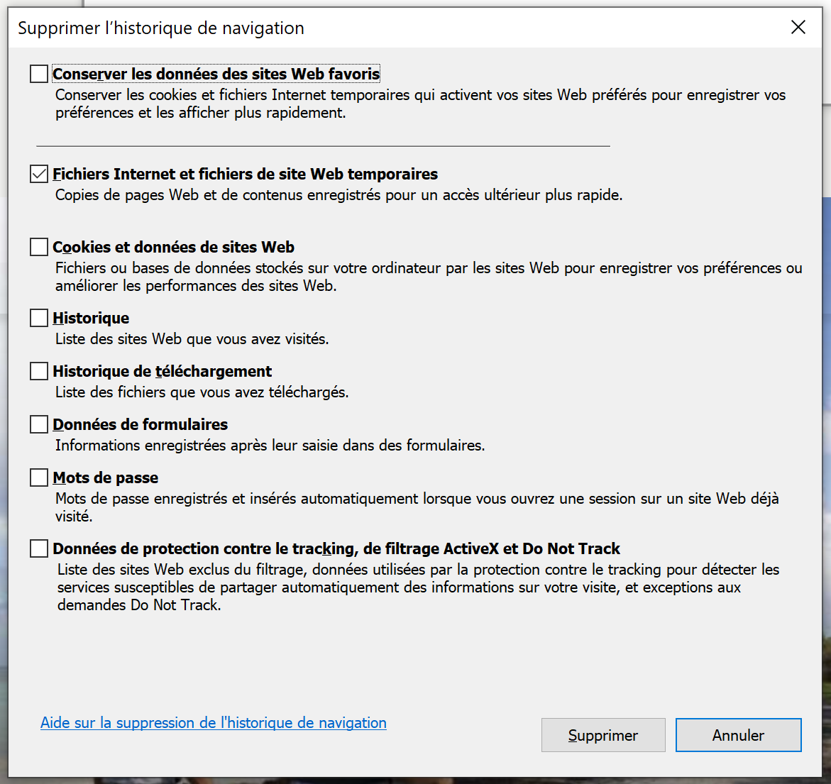• Utiliser le raccourci clavier en maintenant enfoncées les touches : CTRL+MAJ+Suppr. Cochez ensuite seulement la case Fichiers Internet et fichiers de site Web temporaires.