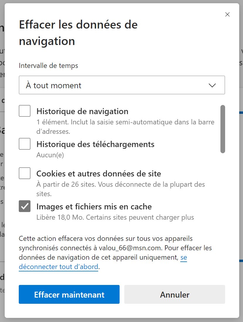 • Utiliser le raccourci clavier en maintenant enfoncées les touches : CTRL+MAJ+Suppr. Cochez ensuite seulement la case Images et fichiers mis en cache.