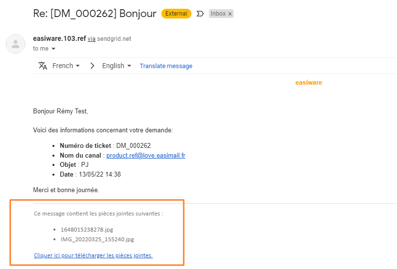 Quand un message est envoyé depuis la solution easiware, comme dans une réponse classique d’un email, les pièces jointes sont accessibles tout en bas de l’email comme le montre la capture d’écran ci-dessous. Il vous faudra alors cliquer sur ''Cliquer ici pour télécharger les pièces jointes''.