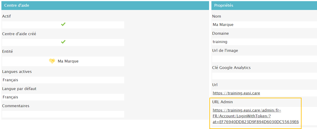 Vous êtes sur la page contenant toutes les informations du centre d’aide et vous avez l’URL Admin. Cliquez sur ce lien :