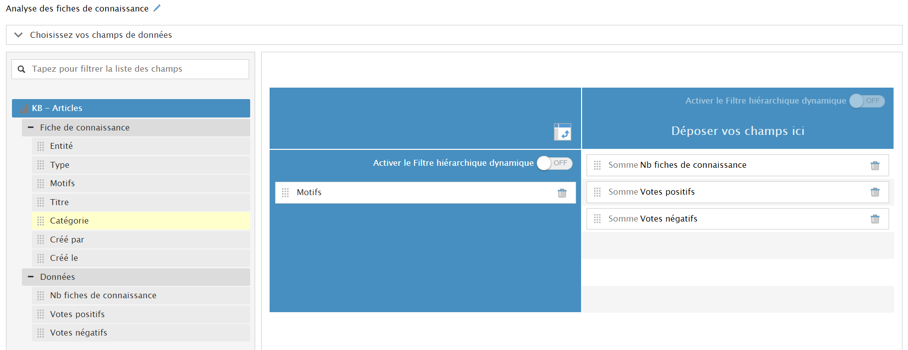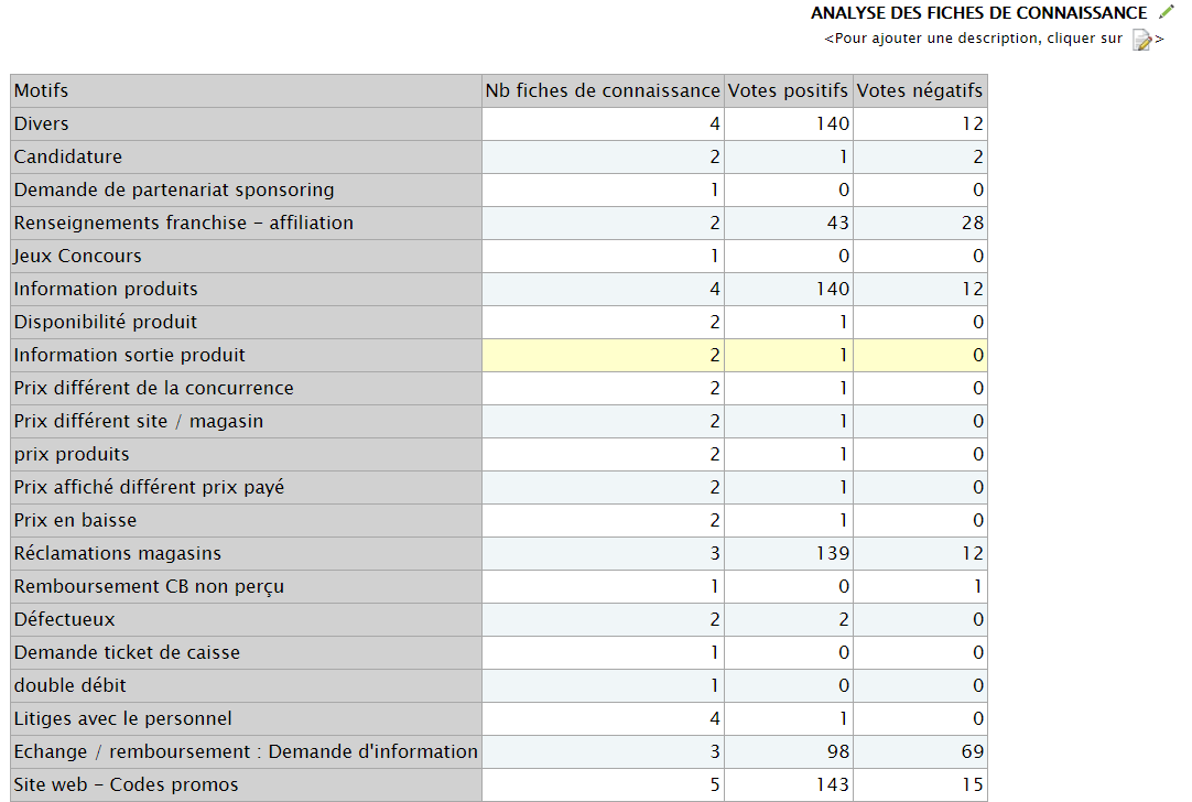 L’analyse des fiches de connaissance vous permet par exemple de voir par motif le nombre de fiches de connaissance avec le détail des votes (positif ou négatif) :