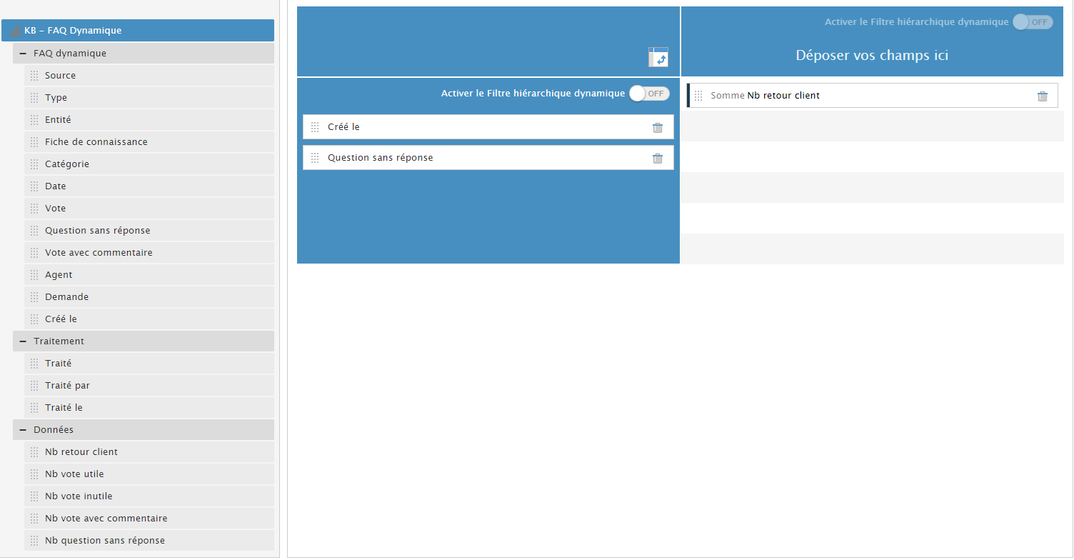 Pour créer vos reportings easicare vous avez beaucoup de possibilités différentes qui vous sont proposées grâce aux différents champs de gauche (FAQ dynamiques , traitement et données).