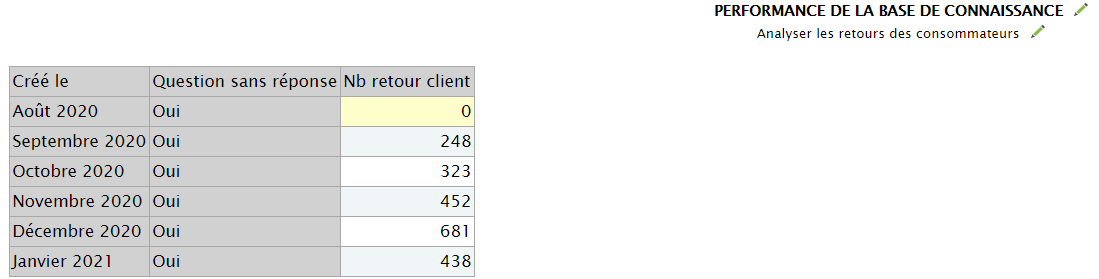 La performance de la base de connaissance vous permet d’analyser la volumétrie des retours clients. ici , vos allez analyser le nombre de retour client avec une question posée dans la base de connaissance sans réponse trouvée :