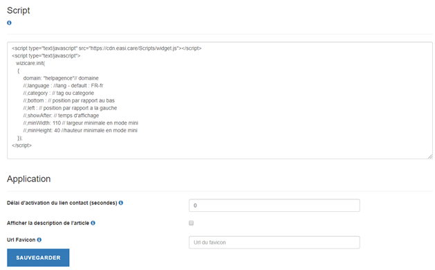 Vous voyez le code du script du widget à mettre sur le site web (paramètres et règles de déclenchement) :