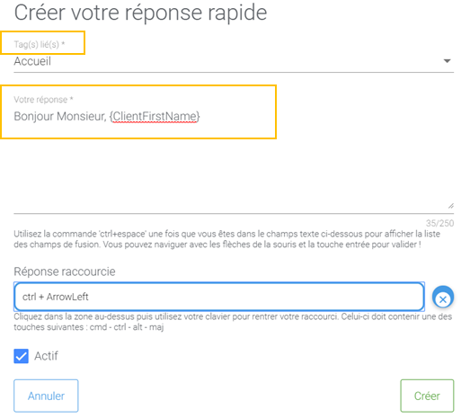 Quand vous créez votre réponse rapide, vous pouvez insérer des champs de fusion en faisant « ctrl+espace » :