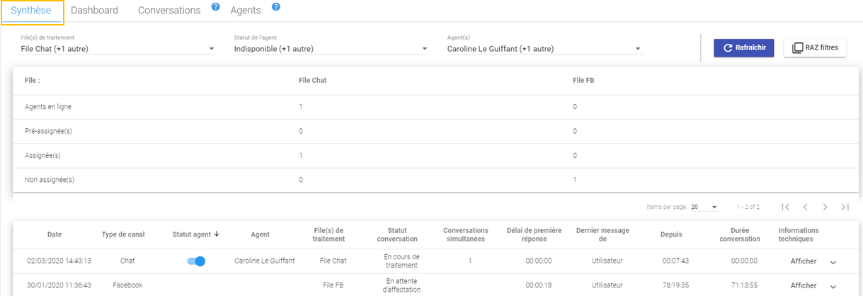 Vous avez accès à une synthèse que vous pouvez filtrer par file de traitement chat , statuts agent et nom des agents :