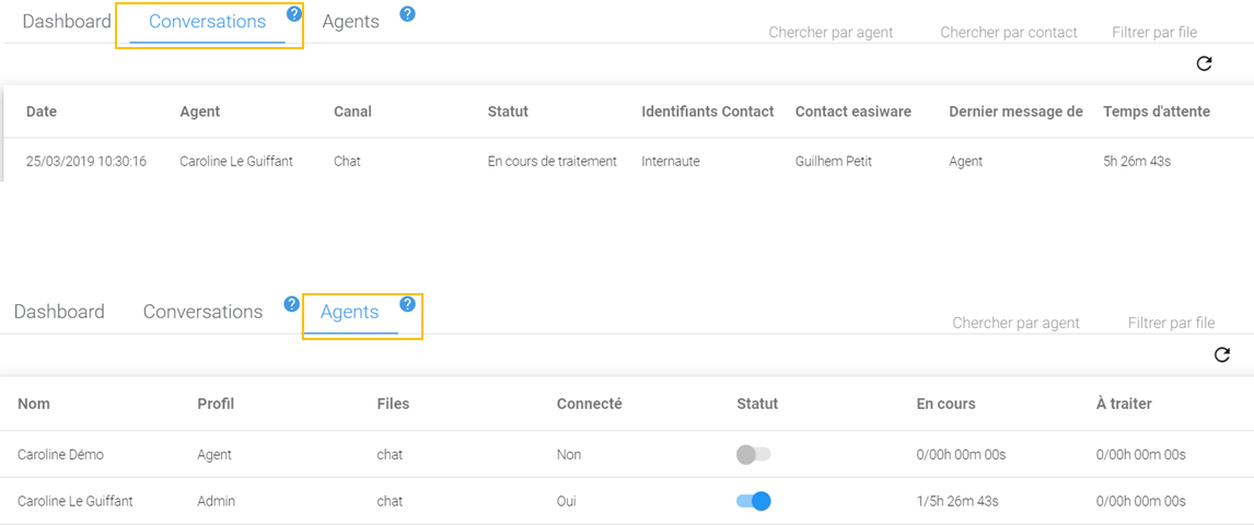 Vous avez également accès au détail des conversations agents en cliquant sur “conversations” et “agents” :