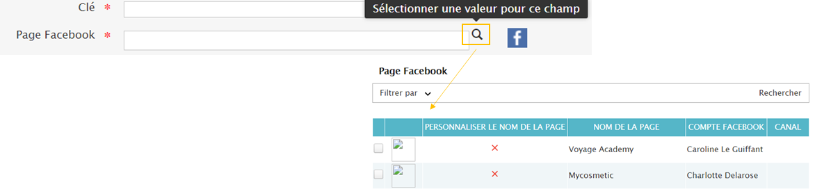 Ensuite, cliquez sur la “loupe” afin de sélectionner la page Facebook à insérer dans ce canal easiware Facebook :