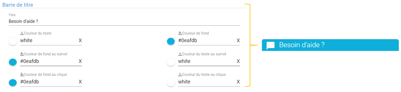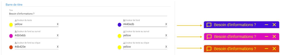 Ces champs vous permettent de personnaliser la barre de titre du widget client en mode lecture, survol ou clic. Ci-dessous un exemple de personnalisation :