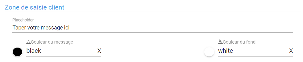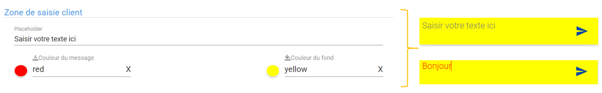 Ces champs vous permettent de personnaliser les couleurs de votre champs de saisie de message ainsi que le texte inscrit dans la zone : cf. exemple ci-dessous :