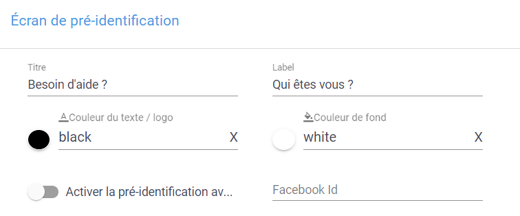 Activer la pré identification du client : C’est demander à l’utilisateur du chat de s’identifier en amont avec son identifiant Facebook. L’écran de pré identification est également personnalisable dans son apparence :