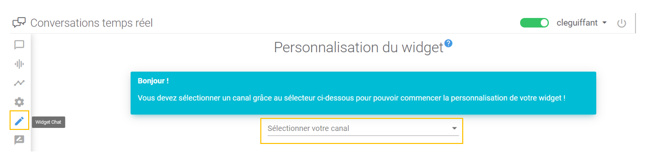 Pour configurer votre widget, cliquez dans le menu déroulant à coté de votre identifiant sur « Panneau d’administration ». Ensuite sur la partie gauche de l’écran, cliquez sur « Widget chat » et Sélectionnez le canal sur lequel vous voulez configurer le widget avec le menu déroulant.