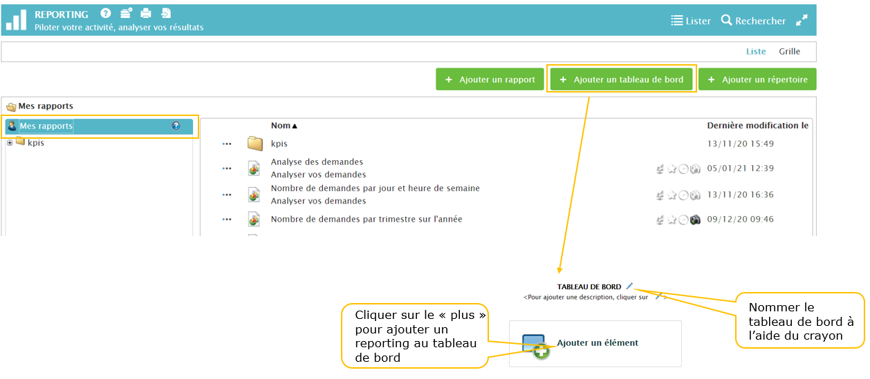 Depuis la bibliothèque de rapports, dans la partie “mes rapports” , cliquez sur “Ajouter un Tableau de bord”, vous pourrez alors ajouter des éléments :
