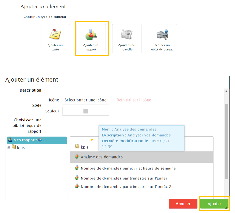 Pour ajouter un reporting que vous avez créé en amont, cliquez sur “Ajouter un rapport”, choisissez le reporting et cliquez sur “ajouter”.