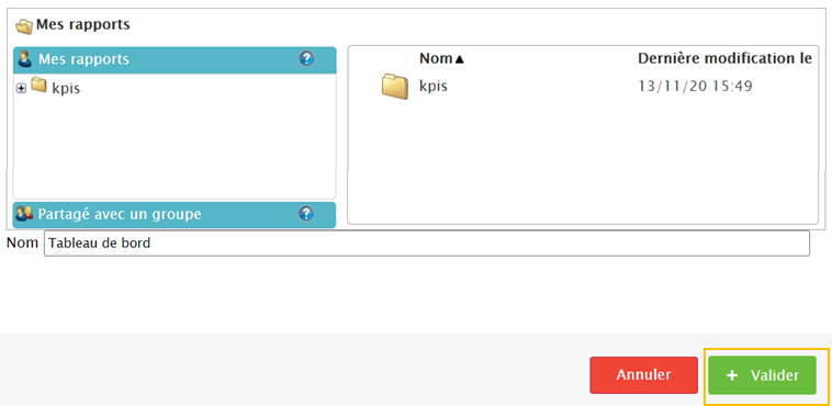 Nommez votre tableau de bord dans la partie “nom” et cliquez sur Valider”.