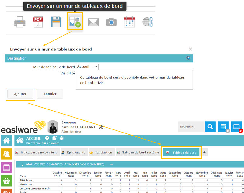 Vous avez la possibilité de mettre votre tableau de bord sur votre page d’accueil. Pour cela, en bas de votre tableau de bord, cliquez sur le picot entouré ci dessous et cliquez sur “ajouter”.