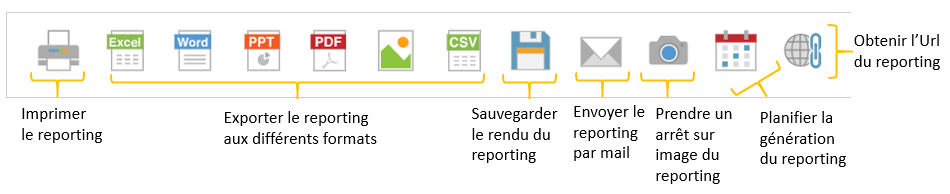 En bas de chaque reporting, les icones ci-dessous apparaissent et vous donnent des options pour gérer vos reportings :