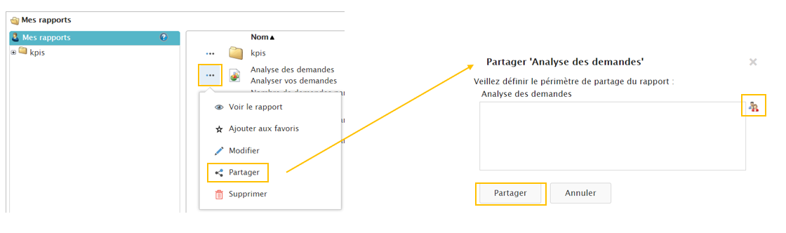 Le partage : Lorsque vous êtes dans votre bibliothèque de rapport, vous pouvez partager un reporting avec une ou plusieurs personnes de easiware en cliquant sur les 3 petits points. La personne trouvera le reporting partagé dans le répertoire “ partagé avec moi”.