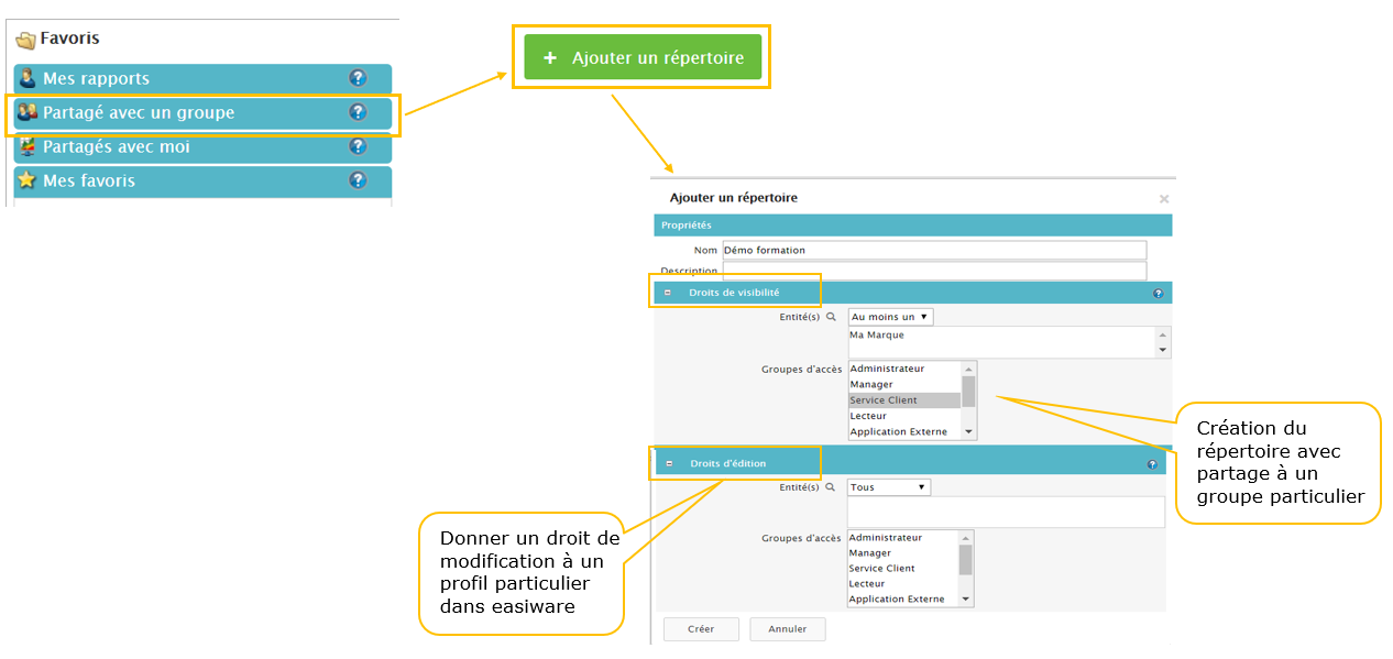 La publication : Pour publier un rapport il faut l’enregistrer dans le répertoire principal « Partagé avec un groupe ». Et créer un répertoire dans lequel vous pourrez donner des droits de visibilité et/ou d'édition à des profils dans easiware.