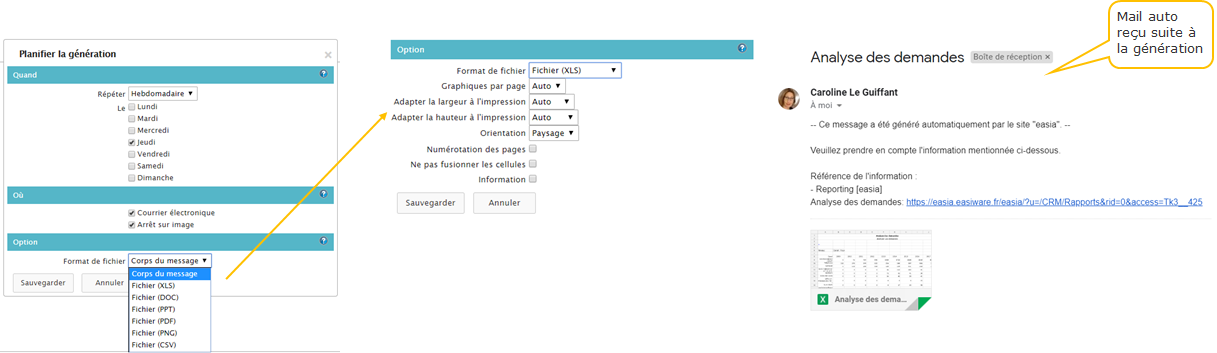 La planification de la génération du reporting : Vous pouvez générer votre reporting à une fréquence choisie (ici tous les jeudis), un format choisi (ici XLS) . Vous recevrez par email votre reporting. Vous ne pouvez pas générer le reporting à une personne n’ayant pas accès à easiware.